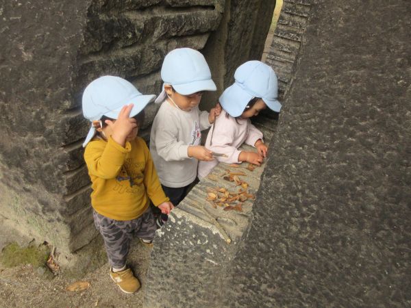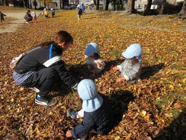 落ち葉遊び 秋は公園の落ち葉でたくさん遊びました。上に「それ」と投げて降らせてみたり、落ち葉の中に足や手を入れて「ないない、あったー」と楽しんだり、落ち葉を食材に見立ててままごと遊びをすることもあります。また、落ち葉がたくさん落ちているところを歩いて「ふかふかするね」「かさかさって音がするね」と音や感触を確かめることもあります。身近な季節の自然物を使って遊ぶ経験をこれからも大切にしていきたいと思います。 2025/12/15