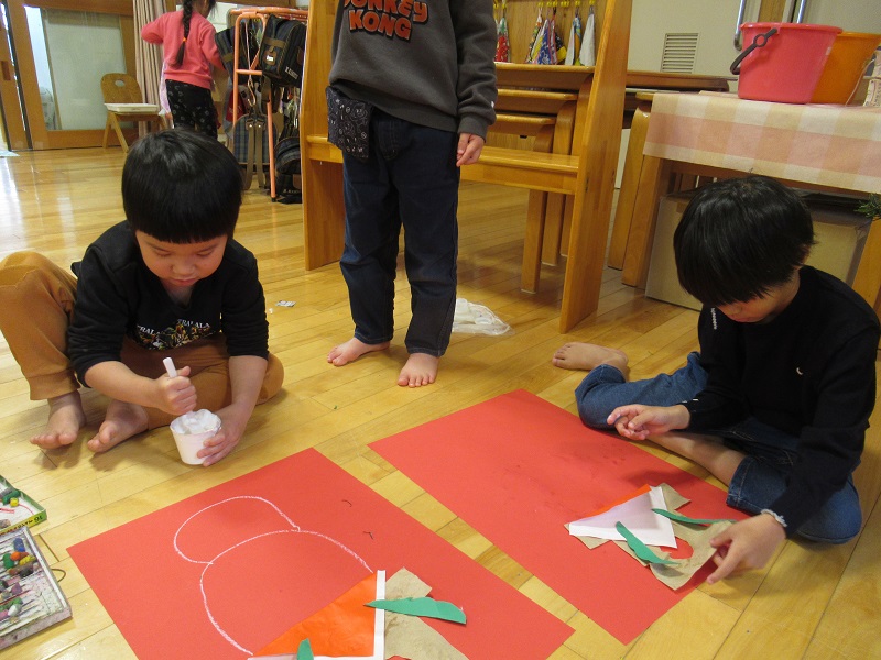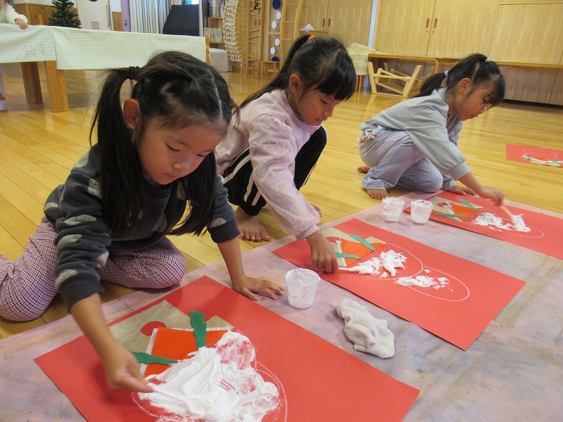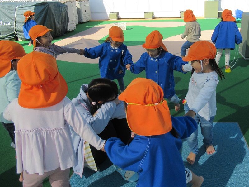 集団あそびを楽しめるようになってきました!『むっくりくまさん』や『あぶくたった』をみんなで楽しんでいます。最初は手が離れてしまったり、鬼の周りを円になって歩くことが難しかったこどもたち。何度も繰り返し遊んでいくうちに、今では友だちに「手をつなごう!」と声をかけ、鬼の周りをぐるぐる上手にまわれるようになりました。